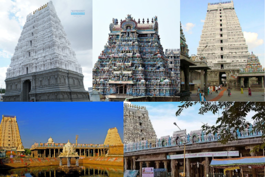 The Nataraja Temple in Chidambaram is dedicated to Lord Shiva in his form as Nataraja, the cosmic dancer. This temple represents the Ether element (Akash), symbolizing space, cosmic consciousness, and the infinite. Lord Shiva, as Nataraja, is depicted dancing in the cosmic space, representing the continuous cycle of creation and destruction.